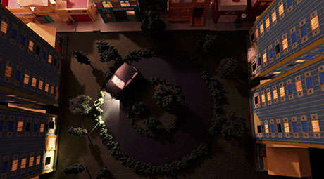 On the gravel path below our window a lit-up car drives in circles.